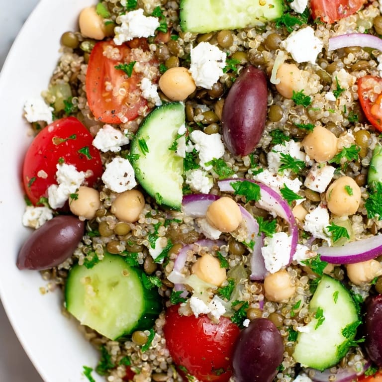 Simply omit the feta cheese or substitute it with a plant-based alternative. All other ingredients are naturally vegan. The salad remains protein-rich thanks to the quinoa, lentils, and chickpeas, making it an excellent plant-based meal.